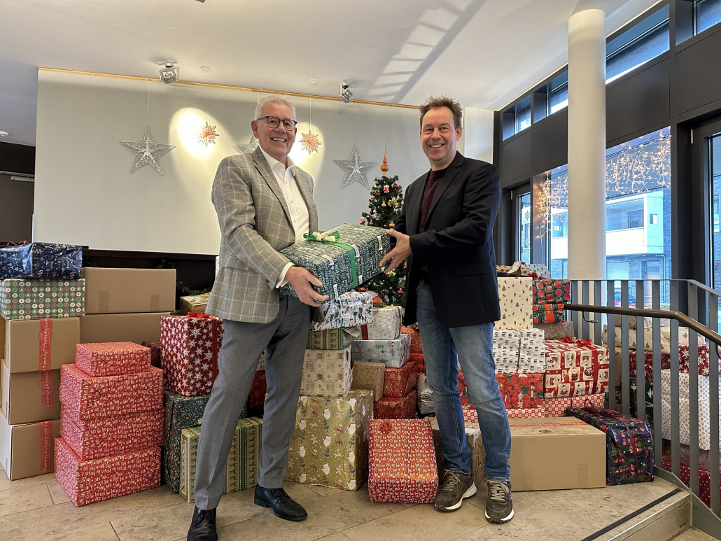 Hotelchef Marc Roelofs vom Hotel Begarden Hof (rechts) übergibt Harald Augustin, Geschäftsführer der Kölner Tafel Stiftung und Organisator der Weihnachtspaketaktion (links) die Pakete, die im Hotel abgegeben wurden.