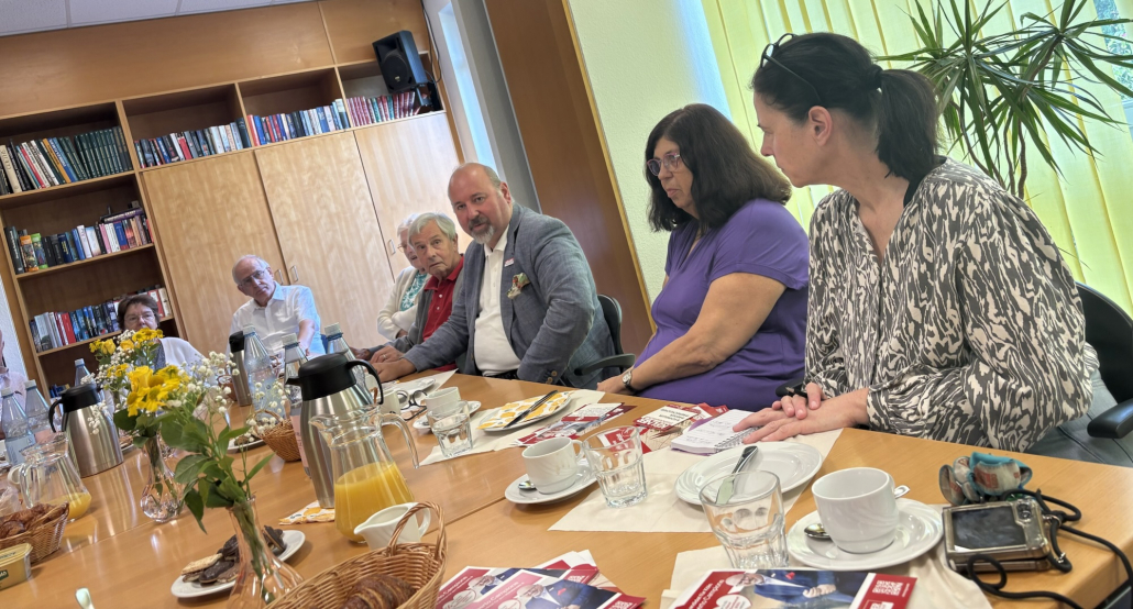 AktuellesAm Vormittag des 21.8, Punkt 10 Uhr, duftet es bei der ASB auf der Ringstraße nach frischem Kaffee und Croissants. Erdbeermarmelade und Butter stehen auf den Tischen bereit, und rund 15 Seniorinnen und Senioren nehmen gemütlich Platz. Anlass ist ein besonderer Austausch: Oberbürgermeisterkandidat Roberto Campione und der kommunale Kandidat Michael Brotesser von der Kölner Stadtgesellschaft sind zu Gast.