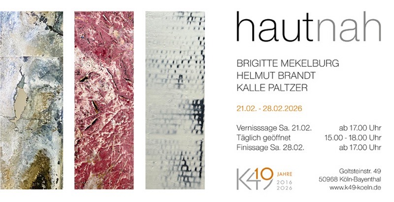 HAUT und NÄHE lassen unmittelbar an Berührung denken. Der Titel „hautnah“ beschreibt diese besondere Nähe, die einer Berührung vorausgeht. Genau darum geht es in den Bildern, Objekten und Skulpturen des Künstlertrios Brigitte Mekelburg, Helmut Brandt und Kalle Paltzer. Während Brandt hauchdünne Acryl-Farbhäute von Glasplatten löst und sie als glatte, gebrochene, rissige oder fragmentierte Schichten auf Leinwände überträgt, suggerieren Paltzers Papierschichten Verletzungen, Äderchen, Gerippe und Zerbrechlichkeit. Mekelburg verwendet Gips, Wachs und Kaseinfarbe für ihre eigentümlichen Kreationen, die sich zwischen Organischem und Gestaltetem bewegen. Was alle Arbeiten miteinander verbindet ist, dass sie die Betrachtenden reizen, die Oberflächen zu berühren, statt nur „mit dem Auge zu fühlen“.