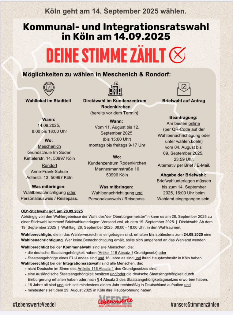 Köln besteht, wie bekannt, aus 180 verschiedenen Nationen und über 40 % unserer Bürger haben einen Migrationshintergrund. Das heißt, in jeder Familie und in jedem Freundes- sowie Arbeitskreis sind Menschen anderer Herkunft. Darum gibt es einen Integrationsrat der Stadt Köln. Das ist ein gewähltes Gremium, das die Interessen von Menschen mit Migrationshintergrund vertritt und sich für Chancengleichheit sowie gleichberechtigte Teilhabe einsetzt. Sie möchten eine inklusive, vielfältige und diskriminierungsfreie Stadtgesellschaft und sind ein beratendes Organ und ein kommunales Fachgremium für den Stadtrat. Darum werden auch die Mitglieder des Integrationsrats im Herbst neu gewählt. Bei dieser Wahl sind alle wahlberechtigt, die am Wahltag mindestens 16 Jahre alt und nicht deutsche Staatsangehörige sind, sich aber seit mindestens einem Jahr rechtmäßig in Deutschland aufhalten. Auch können Personen wählen, die die deutsche Staatsangehörigkeit durch Einbürgerung erhalten haben oder neben der deutschen auch eine ausländische Staatsangehörigkeit besitzen, sowie alle Kinder ausländischer Eltern, die durch ihre Geburt im Inland die deutsche Staatsangehörigkeit erworben haben.