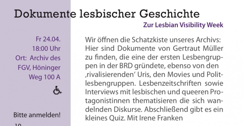 Da die Plätze begrenzt sind, ist für alle Veranstaltungen eine verbindliche Anmeldung erforderlich. Aktuelle Termine, detaillierte Informationen und die Möglichkeit zur Anmeldung finden sich auf der Website des Vereins unter: frauengeschichtsverein.de.