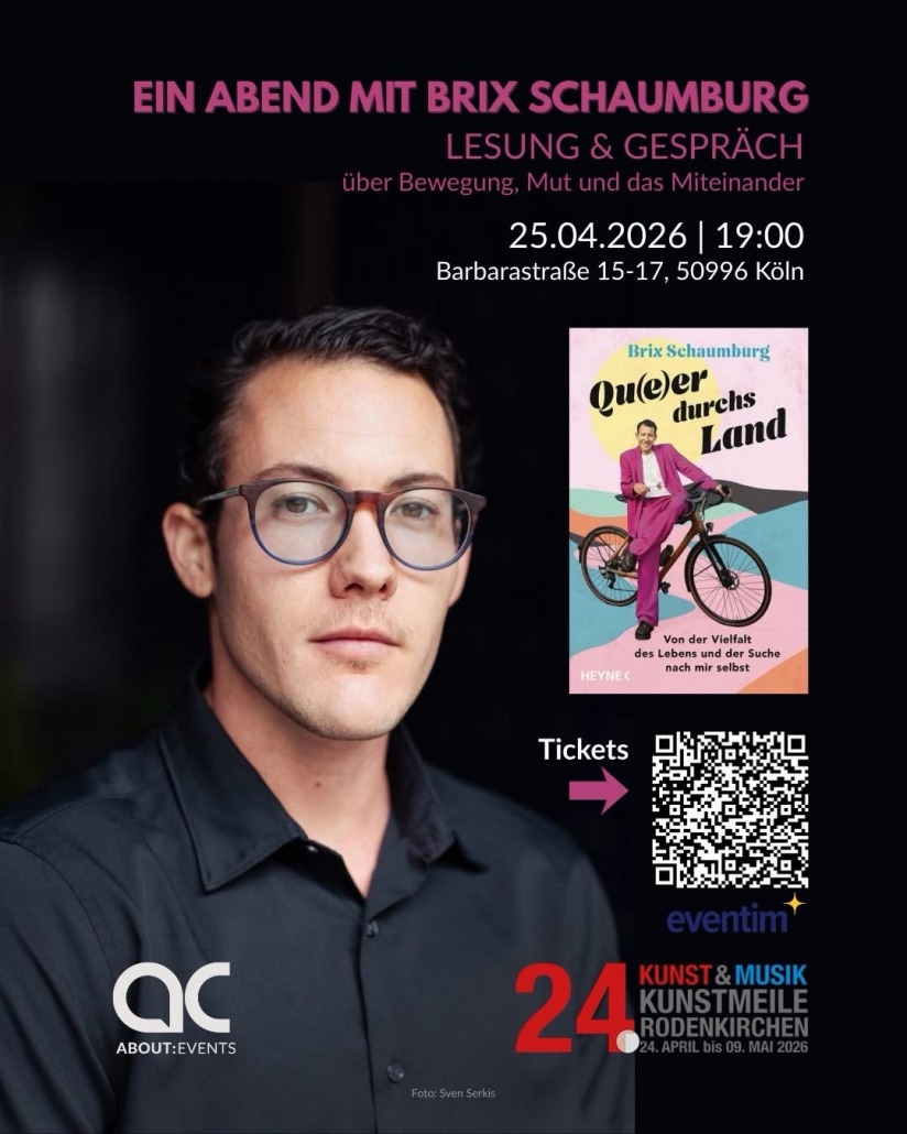 Im Rahmen der 24. Kunst- und Kulturmeile kommt Autor, Schauspieler, Moderator und leidenschaftlicher Radfahrer Brix Schaumburg zu uns in den Kölner Süden – mit einer besonderen Mischung aus Lesung, Gespräch und musikalischen Elementen steht er bei @about_events_official auf der Bühne. Schon im vergangenen Jahr war das Format „Ein Abend mit…“ ein voller Erfolg. Umso mehr freuen wir uns, dass es auch 2026 weitergeht.