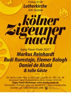 Gypsy Power Tour: Im Rheinland gibt es eine erstaunliche Vielfalt an Sinti-, Roma-, bzw. Zigeunerkulturen*. Sowohl alteingesessene Musikerfamilien als auch zugewanderte Künstler aus Osteuropa und Südeuropa. Diesen Reichtum wollen wir erhalten und fördern, auch weil diese Musik- und Festkultur eine wichtige Rolle für eine friedliche, zukunftsfähige Gesellschaft spielen kann. (*die beteiligten Künstler verwenden den alten Kulturbegriff »Zigeuner« mit Stolz und wollen seine positive Seite stärken.) www.facebook.com/ZigeunerfestivalJetzt Tickets sichern: https://lutherkirche.ticket.io/NT2f242o/