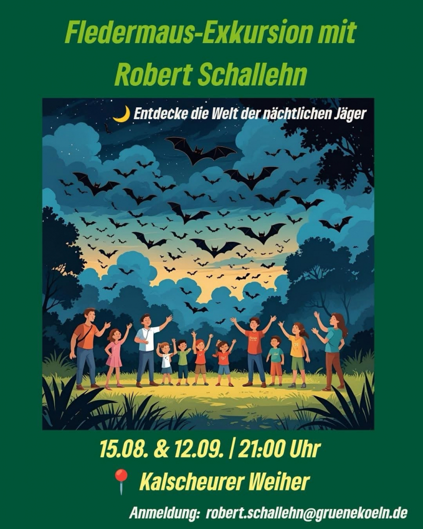 Lautlos, flink und faszinierend: Tauche ein in die geheimnisvolle Welt der Fledermäuse! Gemeinsam mit dem Biologen und GRÜNEN-Direktkandidaten für Zollstock, Robert Schallehn, erkunden wir bei einer abendlichen Tour das Leben dieser nächtlichen Akrobaten.