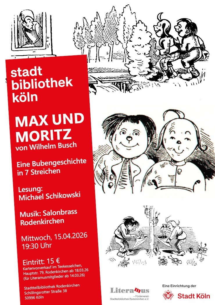 Am 15. April 2026 um 19:30 Uhr steht ein Klassiker der deutschen Literatur in der Stadtteilbibliothek Rodenkirchen, Schillingsrotter Str. 38, im Mittelpunkt: „Max und Moritz – eine Bubengeschichte in sieben Streichen“ von Wilhelm Busch. In einer lebendigen Lesung lässt Michael Schikowski die berühmt-berüchtigten Lausbuben wieder für Erwachsene auferstehen, wird musikalisch begleitet vom Salonbrass Rodenkirchen. Mit großer Spielfreude und feinem Gespür für Zwischentöne präsentiert Michael Schikowski die Geschichten nicht nur als humorvolles Lesevergnügen, sondern auch als satirischen Spiegel bürgerlicher Moralvorstellungen des 19. Jahrhunderts. Für die passende musikalische Einbettung sorgt eine Gruppe von Blechbläsern, die fest verankert in der lebendigen Musikszene des Stadtteils sind. Karten und weitere Informationen finden Sie auf www.literamus.de