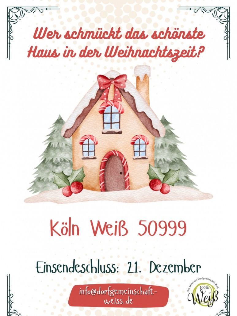 Die Dorfgemeinschaft Weiß 1962 e.V. lädt alle Bewohnerinnen und Bewohner herzlich zum diesjährigen Weihnachts-Wettbewerb ein! Gesucht wird das schönste, festlich geschmückte Haus in unserem Dorf.